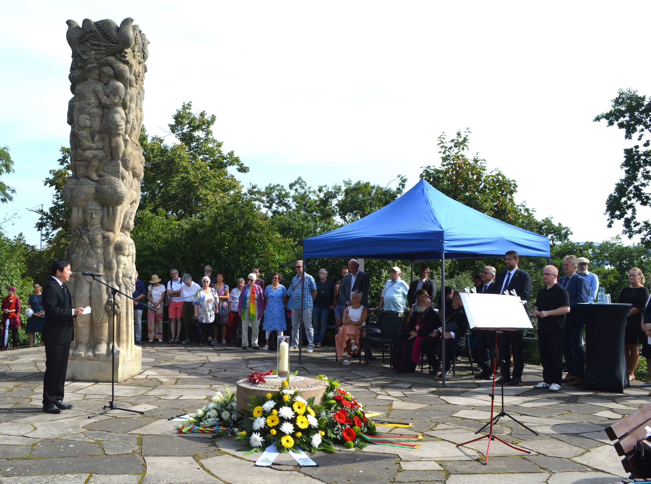 Zum Auftakt hatte der Präsident der Deutsch-Japanischen Gesellschaft Sachsen-Anhalt e.V., Tim Schneider, die Gäste am Fuß des Lukashügels begrüßt. Nach dem musikalisch umrahmten Gedenken an der Stele und einem Ökumenischen Friedensgebet zum Abschluss folgten viele Gäste der Einladung von Vereinen und Friedensinitiativen zu einer Informationsveranstaltung, die auf der Wiese der Städtepartnerschaften am Askanischen Platz stattfand. Dort präsentierte sich zum Beispiel der Weltladen in Trägerschaft des Vereins Magletan Eine Welt. Er ist ebenso wie die Deutsch-Japanische Gesellschaft eine von rund 50 Mitgliedsorganisationen der Auslandsgesellschaft Sachsen-Anhalt e.V.